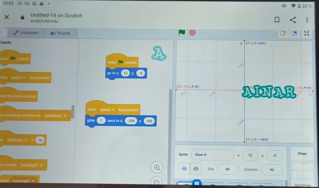 En esta clase, hemos trabajado las coordenadas en los ejes X e Y. Para la clase de 6º de Primaria, puede ser prematuro insertar los números negativos, pero como habíamos ya programado en Scratch varios videojuegos usando dichas coordenadas, las hemos mantenido. En caso de usar esta actividad para cursos más pequeños, se puede montar el cuadrante + de los ejes X e Y, es decir, trabajar solamente con números positivos. Ejem. (5, 7)